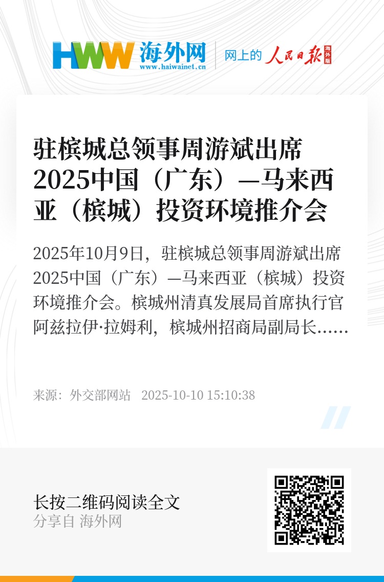 2025年10月9日,驻槟城总领事周游斌出席2025中国(广东)—马来西亚(槟城)投资环境推介会。槟城州清真发展局首席执行官阿兹拉伊·拉姆利,槟城州招商局副局长李有泽,槟州中华总商会会长祝友成,广东省驻东南亚(吉隆坡)经贸办事处主任张君宏,广东省侨联、珠海高新区及中马企业代表等150余人出席。