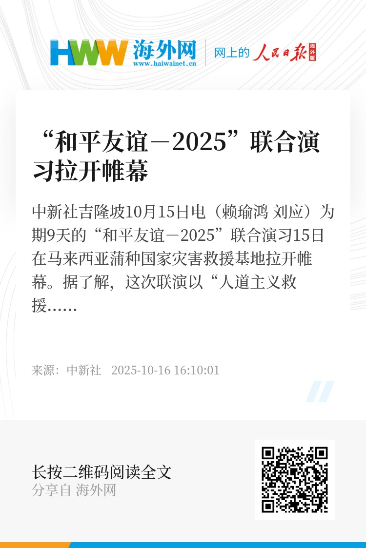 中新社吉隆坡10月15日电(赖瑜鸿 刘应)为期9天的“和平友谊-2025”联合演习15日在马来西亚蒲种国家灾害救援基地拉开帷幕。