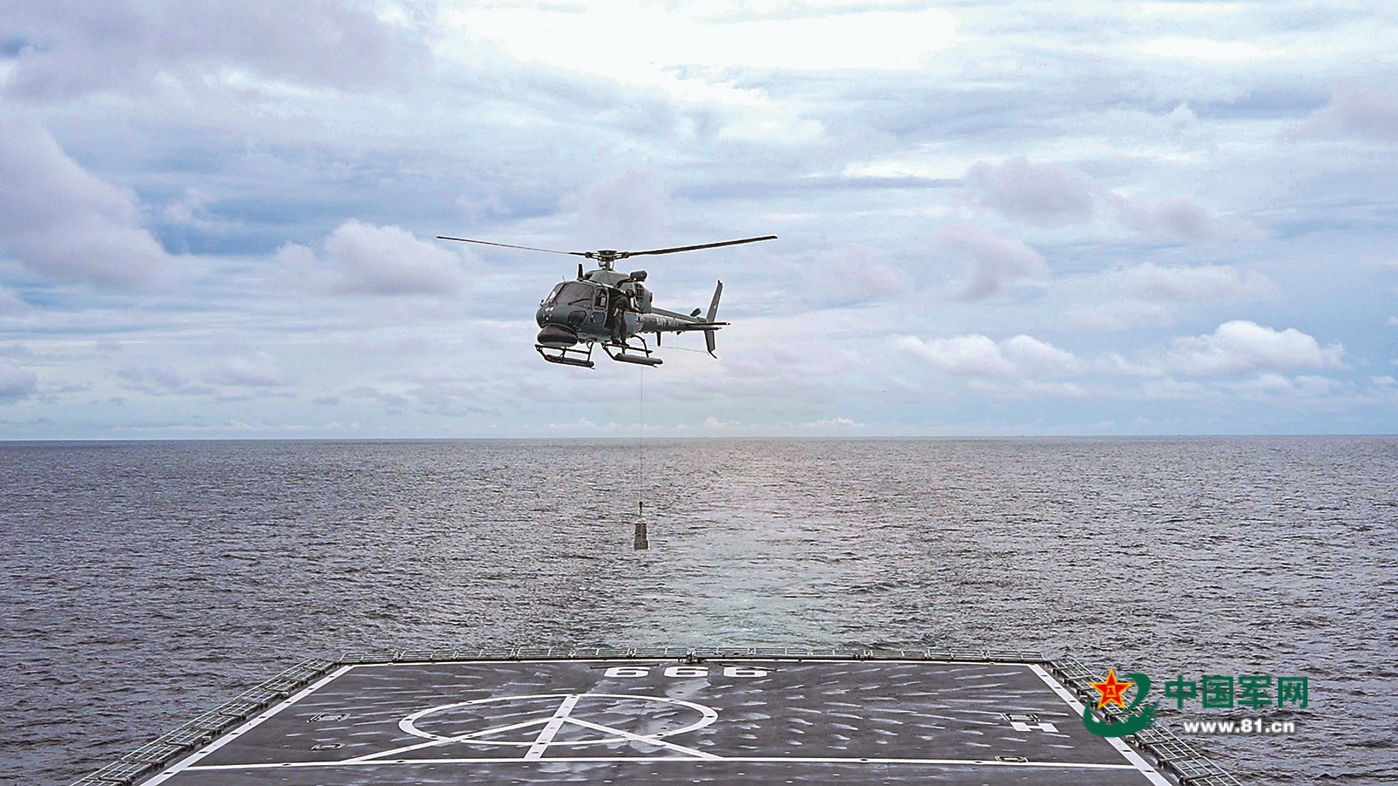 马方直升机与中方井冈山舰开展垂直补给演练。王磊 摄