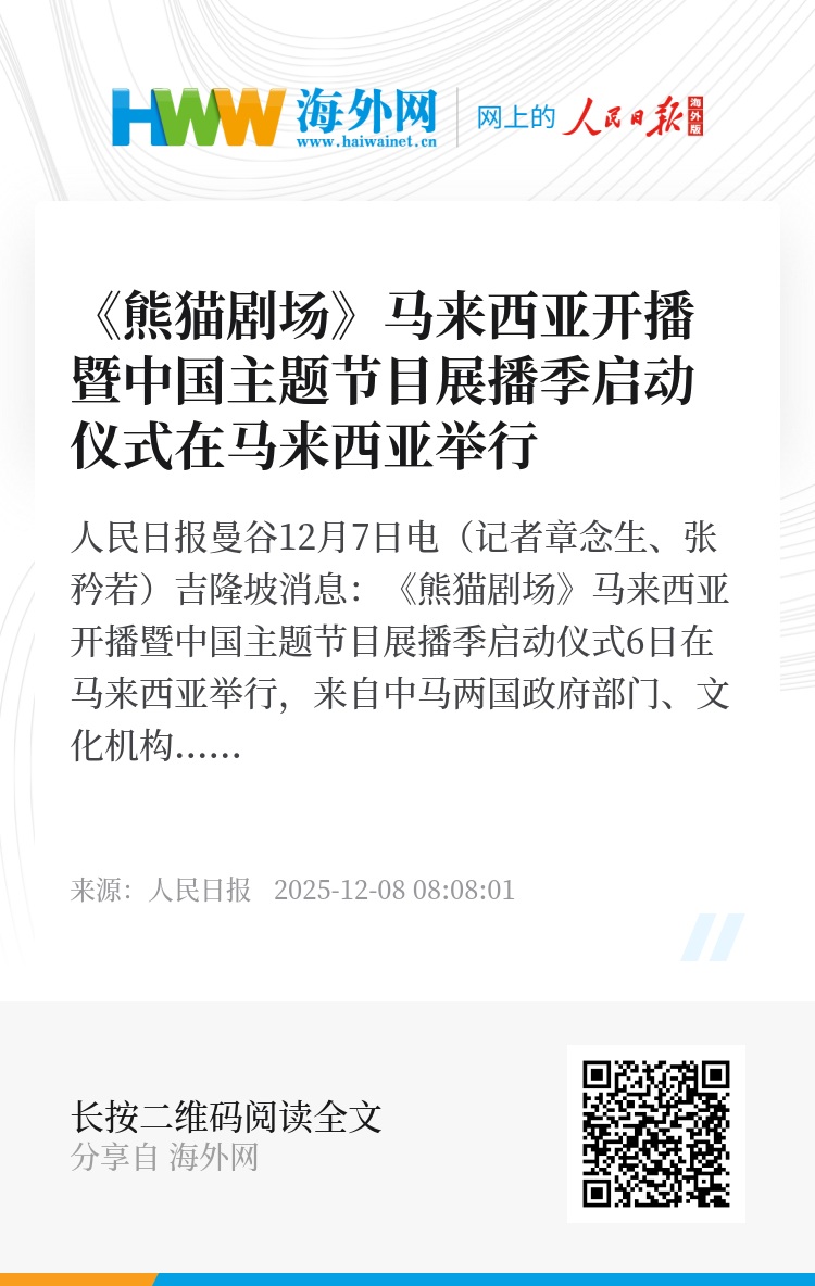 人民日报曼谷12月7日电(记者章念生、张矜若)吉隆坡消息:《熊猫剧场》马来西亚开播暨中国主题节目展播季启动仪式6日在马来西亚举行,来自中马两国政府部门、文化机构与影视艺术产业等百余名代表出席。