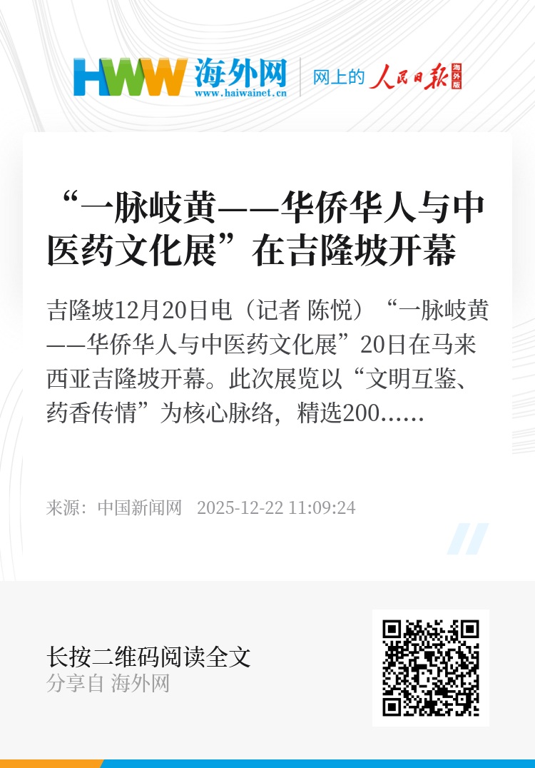 中新网吉隆坡12月20日电(记者 陈悦)“一脉岐黄——华侨华人与中医药文化展”20日在马来西亚吉隆坡开幕。