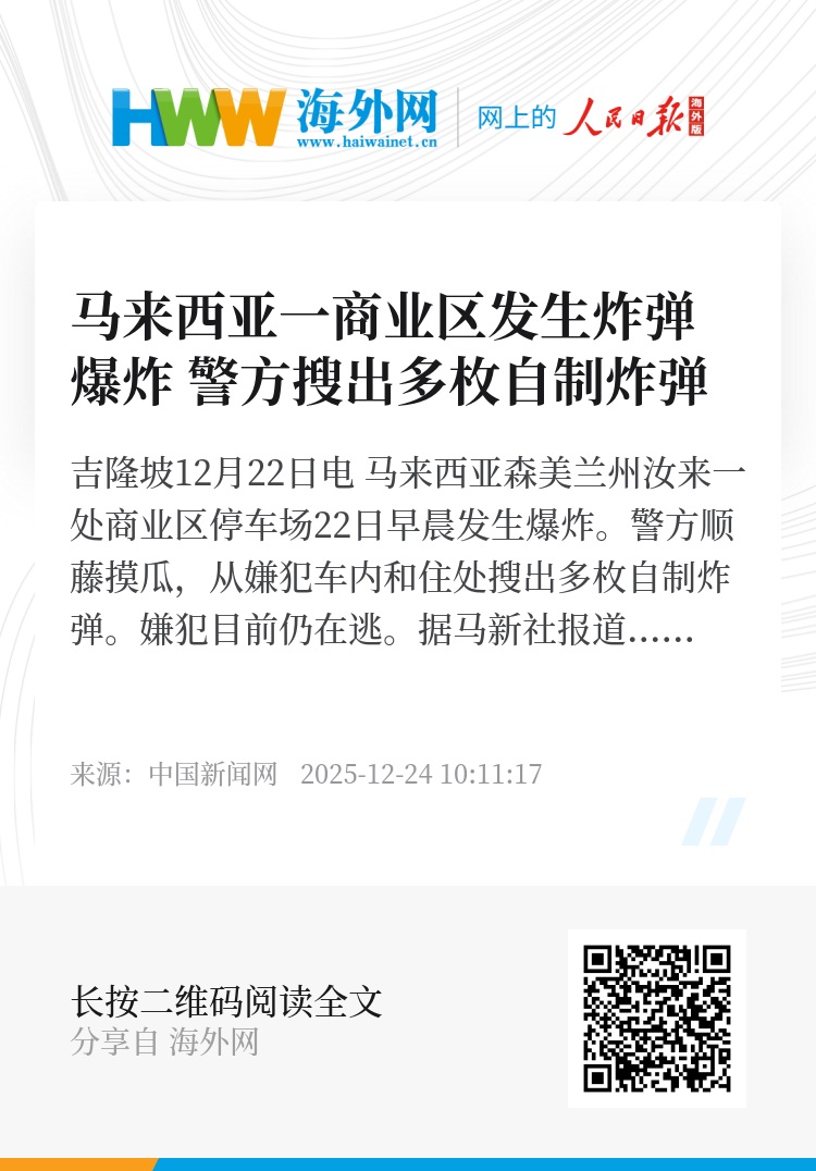 中新网吉隆坡12月22日电 马来西亚森美兰州汝来一处商业区停车场22日早晨发生爆炸。警方顺藤摸瓜,从嫌犯车内和住处搜出多枚自制炸弹。嫌犯目前仍在逃。