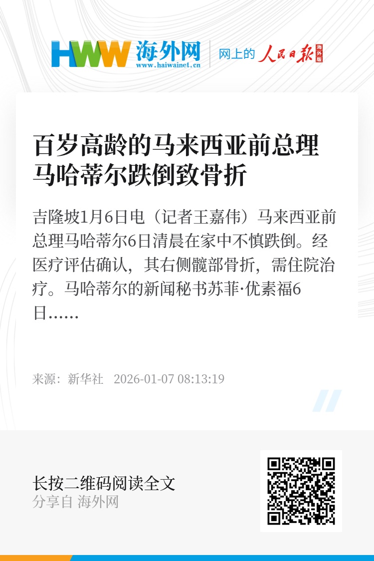 新华社吉隆坡1月6日电(记者王嘉伟)马来西亚前总理马哈蒂尔6日清晨在家中不慎跌倒。经医疗评估确认,其右侧髋部骨折,需住院治疗。