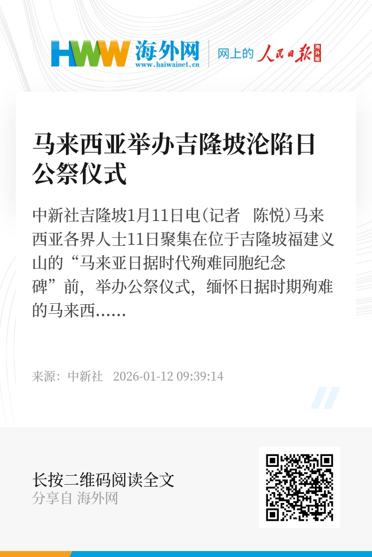 马来西亚二战历史协会秘书长黄金水介绍,1942年1月11日,日军侵占吉隆坡。日据时期,“马来亚人民承受巨大苦难”,“许多家庭失去了他们的家人”。马来西亚民间团体长期坚持在这一天举办活动,铭记历史,缅怀殉难者。