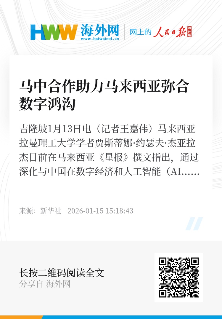 新华社吉隆坡1月13日电(记者王嘉伟)马来西亚拉曼理工大学学者贾斯蒂娜·约瑟夫·杰亚拉杰日前在马来西亚《星报》撰文指出,通过深化与中国在数字经济和人工智能(AI)领域的合作,马来西亚不仅引入先进技术,还在构建包容性数字经济、弥合国内数字发展鸿沟方面迈出关键一步。文章摘要如下: