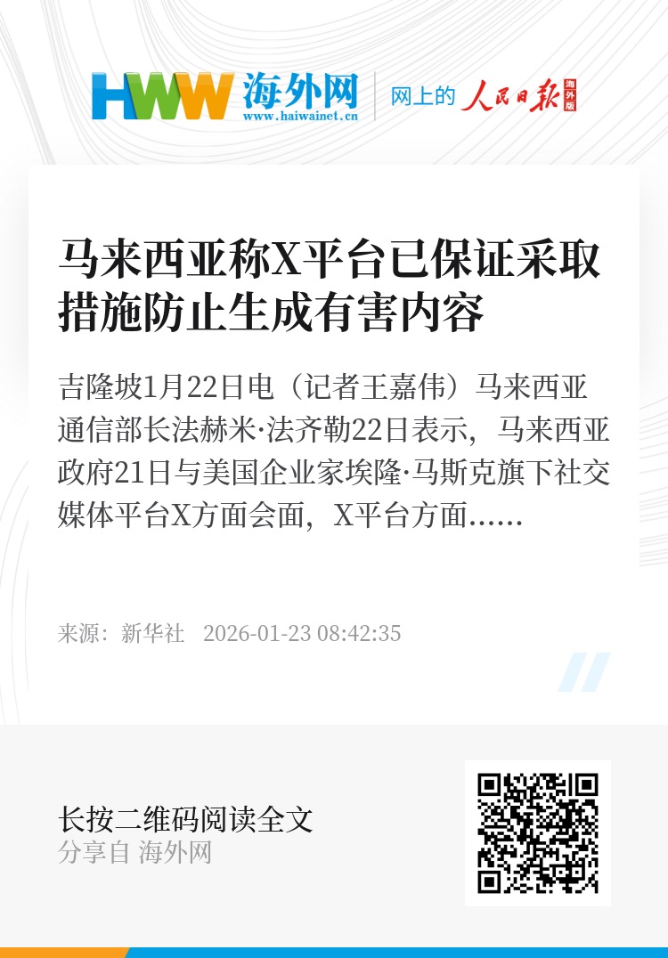 新华社吉隆坡1月22日电(记者王嘉伟)马来西亚通信部长法赫米·法齐勒22日表示,马来西亚政府21日与美国企业家埃隆·马斯克旗下社交媒体平台X方面会面,X平台方面确认已采取有效措施防止其内置的人工智能聊天机器人“格罗克”生成有害网络内容。