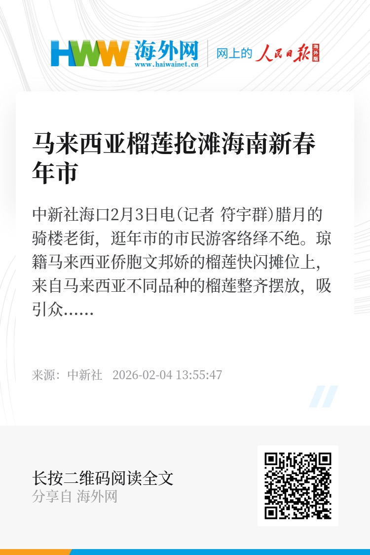 中新社海口2月3日电(记者 符宇群)腊月的骑楼老街,逛年市的市民游客络绎不绝。琼籍马来西亚侨胞文邦娇的榴莲快闪摊位上,来自马来西亚不同品种的榴莲整齐摆放,吸引众人驻足询价、品尝。