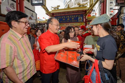 仪式结束后,欧阳大使一行前往茨厂街,走访商铺,同当地华侨华人和中国游客一起共庆中国年。