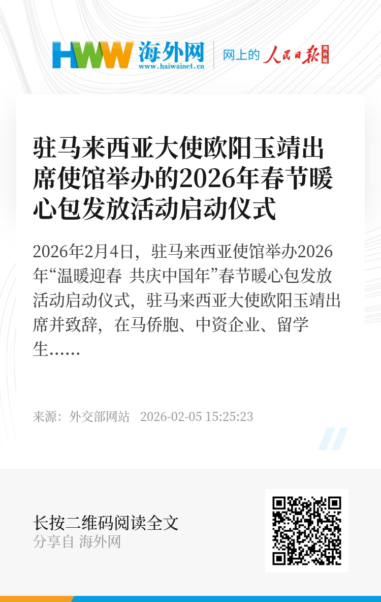 2026年2月4日,驻马来西亚使馆举办2026年“温暖迎春 共庆中国年”春节暖心包发放活动启动仪式,驻马来西亚大使欧阳玉靖出席并致辞,在马侨胞、中资企业、留学生等各界代表参加。