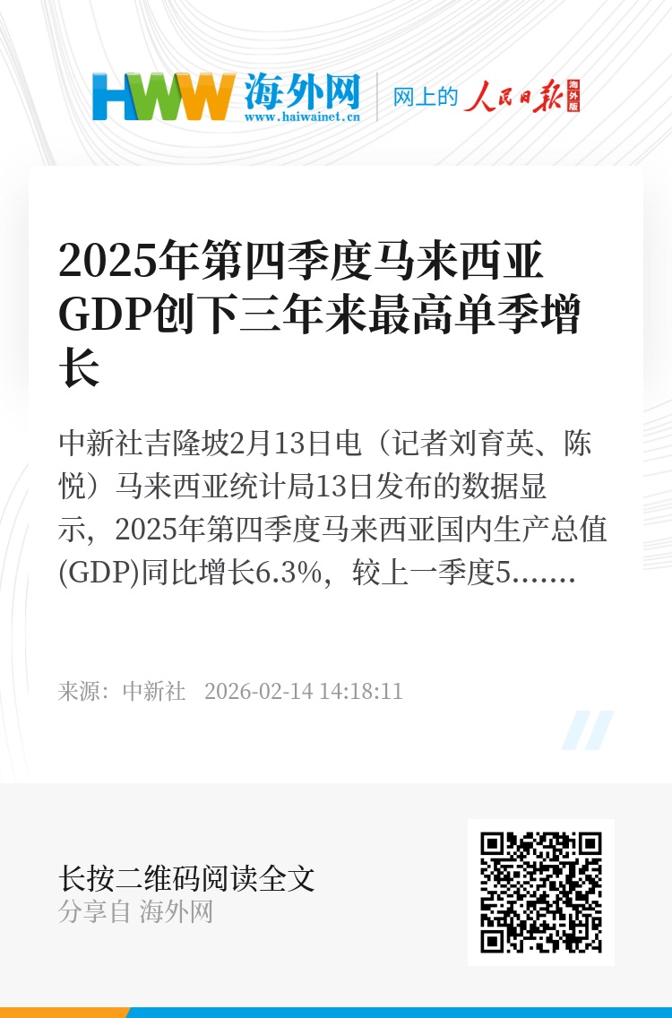 中新社吉隆坡2月13日电(记者刘育英、陈悦)马来西亚统计局13日发布的数据显示,2025年第四季度马来西亚国内生产总值(GDP)同比增长6.3%,较上一季度5.4%的增速有所提升,延续强劲表现。