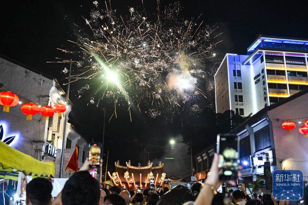 2月21日,在马来西亚槟城州首府乔治市,人们观看烟花表演。新华社记者 程一恒 摄
