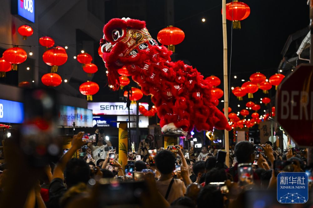 2月21日,在马来西亚槟城州首府乔治市,人们观看舞狮表演。新华社记者 程一恒 摄