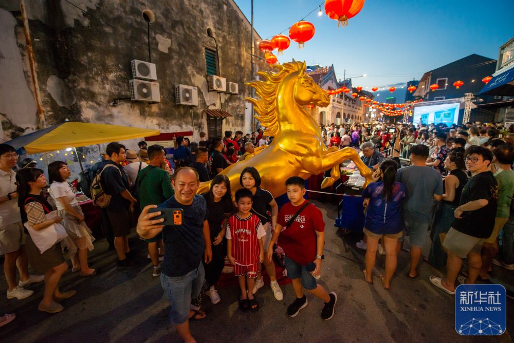 2月21日,在马来西亚槟城州首府乔治市,人们与马年装饰合影。新华社发(张纹综摄)