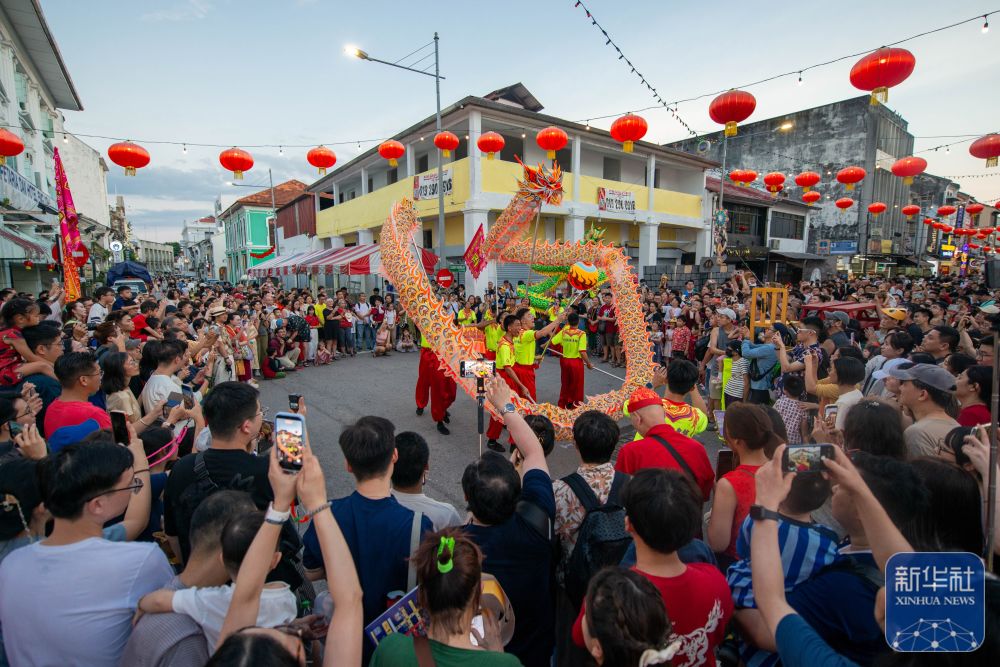 2月21日,在马来西亚槟城州首府乔治市,人们观看舞龙表演。新华社发(张纹综摄)