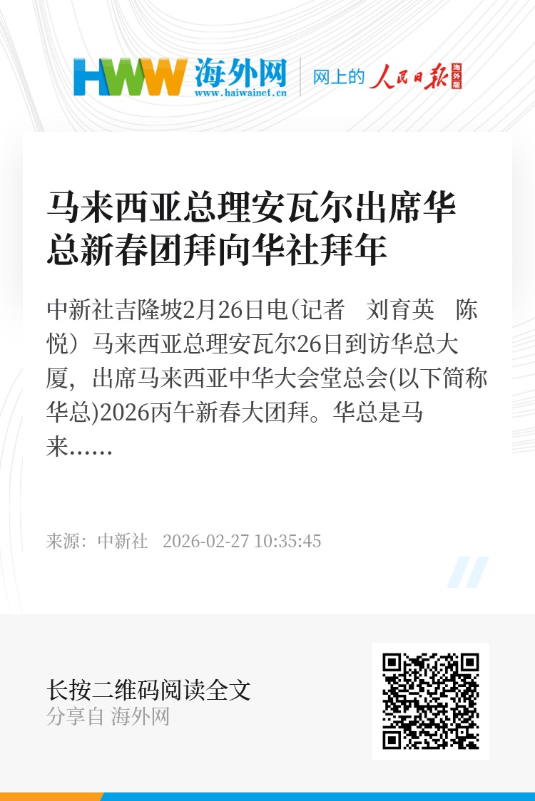 中新社吉隆坡2月26日电(记者 刘育英 陈悦)马来西亚总理安瓦尔26日到访华总大厦,出席马来西亚中华大会堂总会(以下简称华总)2026丙午新春大团拜。