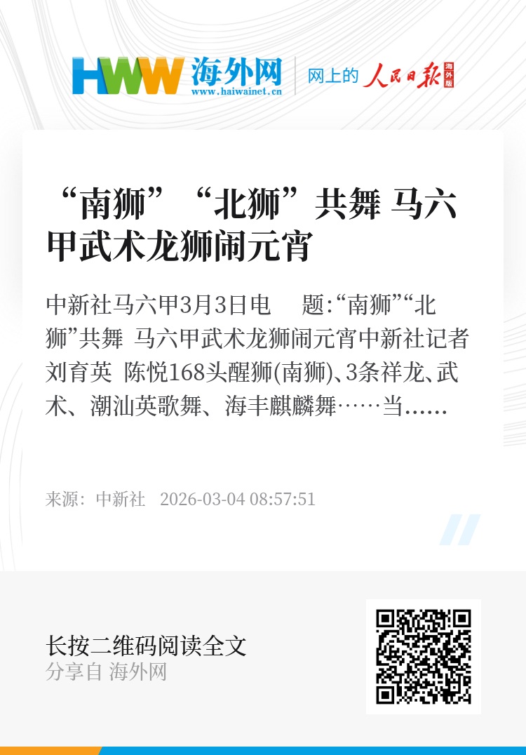 168头醒狮(南狮)、3条祥龙、武术、潮汕英歌舞、海丰麒麟舞……当地时间3月3日晚,第36届马六甲州春节年景嘉年华会呈现的节目丰富多彩,马六甲老街区鸡场街一片欢腾,各族裔民众共庆元宵佳节。