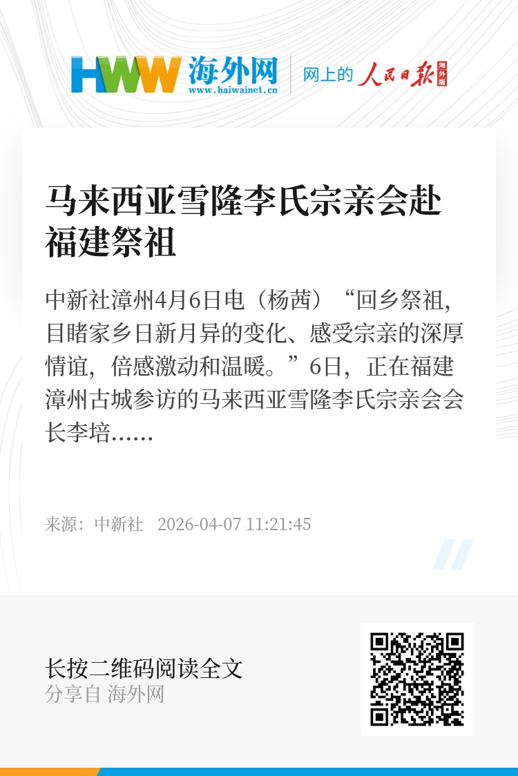 中新社漳州4月6日电(杨茜)“回乡祭祖,目睹家乡日新月异的变化、感受宗亲的深厚情谊,倍感激动和温暖。”6日,正在福建漳州古城参访的马来西亚雪隆李氏宗亲会会长李培华表示,“无论走多远,根始终在这里。”