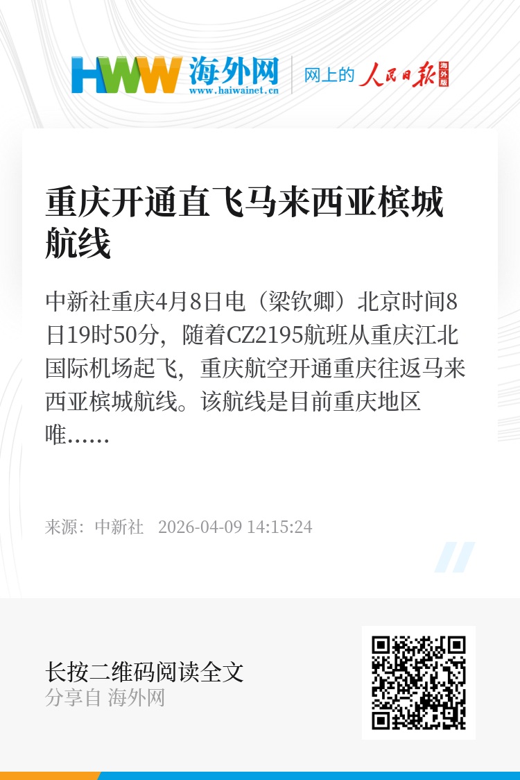 中新社重庆4月8日电(梁钦卿)北京时间8日19时50分,随着CZ2195航班从重庆江北国际机场起飞,重庆航空开通重庆往返马来西亚槟城航线。该航线是目前重庆地区唯一直飞槟城的航线,进一步完善了重庆至东南亚地区的航线网络布局。