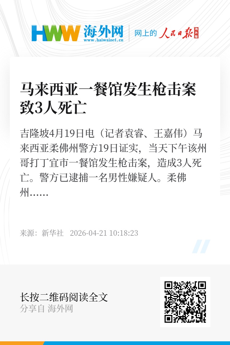 新华社吉隆坡4月19日电(记者袁睿、王嘉伟)马来西亚柔佛州警方19日证实,当天下午该州哥打丁宜市一餐馆发生枪击案,造成3人死亡。警方已逮捕一名男性嫌疑人。