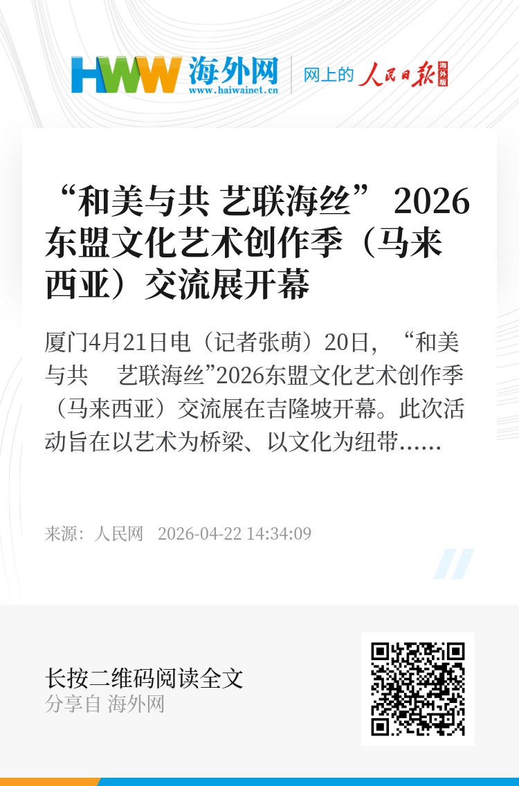 人民网厦门4月21日电(记者张萌)20日,“和美与共 艺联海丝”2026东盟文化艺术创作季(马来西亚)交流展在吉隆坡开幕。此次活动旨在以艺术为桥梁、以文化为纽带,深度践行文明互鉴理念,进一步深化中马两国人文交流,厚植两国人民友谊。